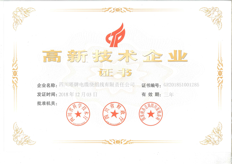 2.2018年12月 四川塔牌電纜繞組線有限責任公司通過“*********************企業”認證。
