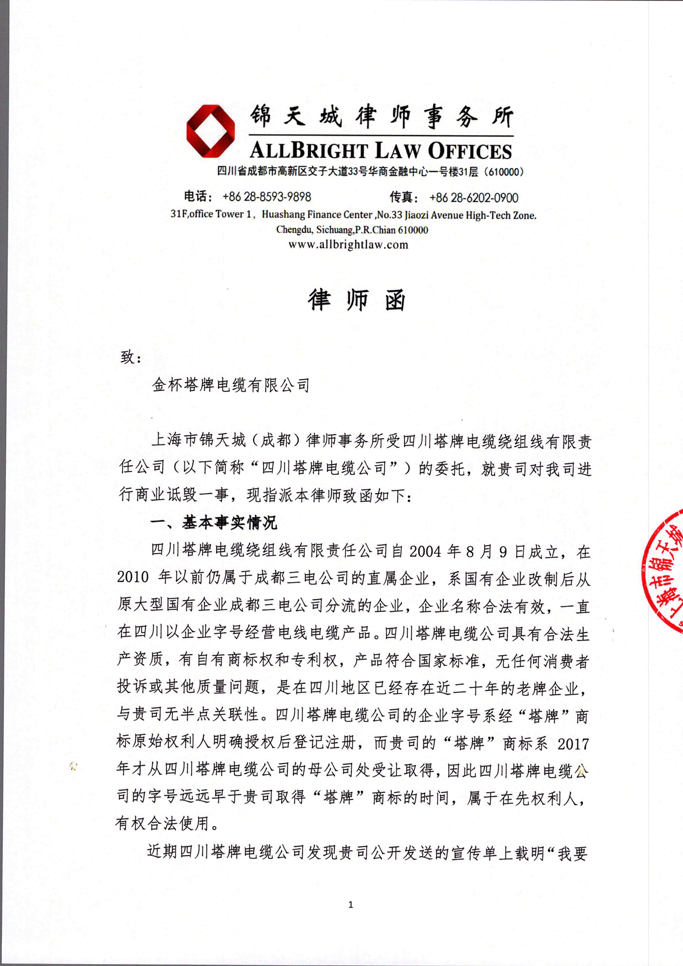 四川塔牌電纜公司致金杯塔牌電纜有限公司律師函