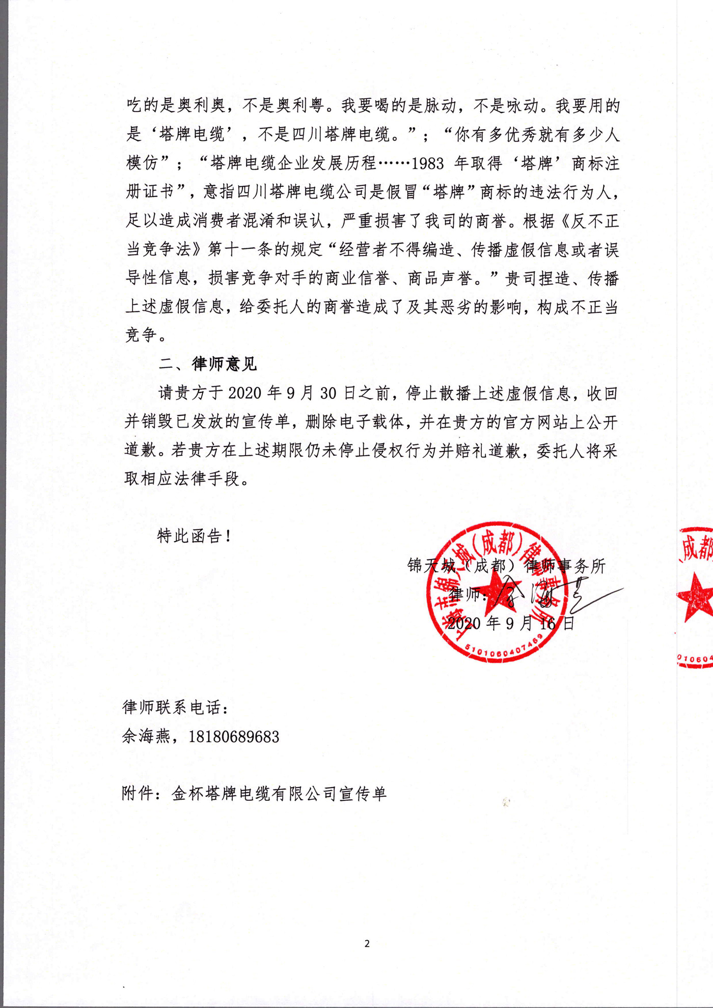 四川塔牌電纜公司致金杯塔牌電纜公司及旗下經(jīng)銷商的律師函